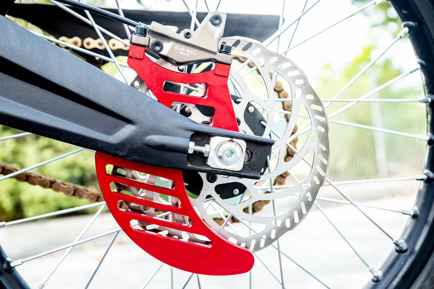 New in-house manufactured CNC rear disc guard for Sur Ron X Bike and Segway X160 / X260 Dirt eBikes. Disc guard also replaces cast aluminum caliper mount. Direct bolt on.